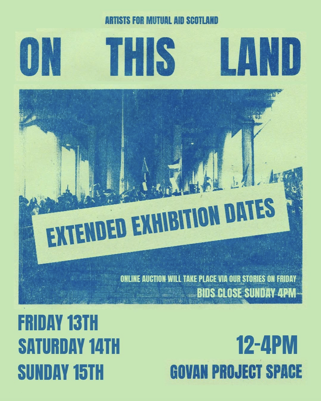 After a successful fundraiser event on 7th February, the exhibition On This Land will continue at Govan Project Space from 13th–15th February, 12-4pm.
